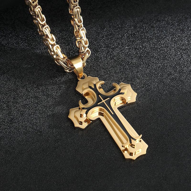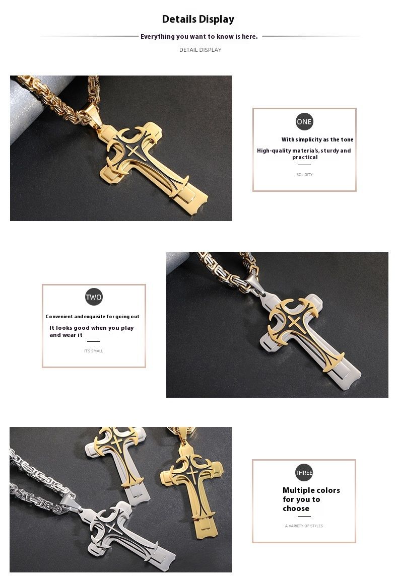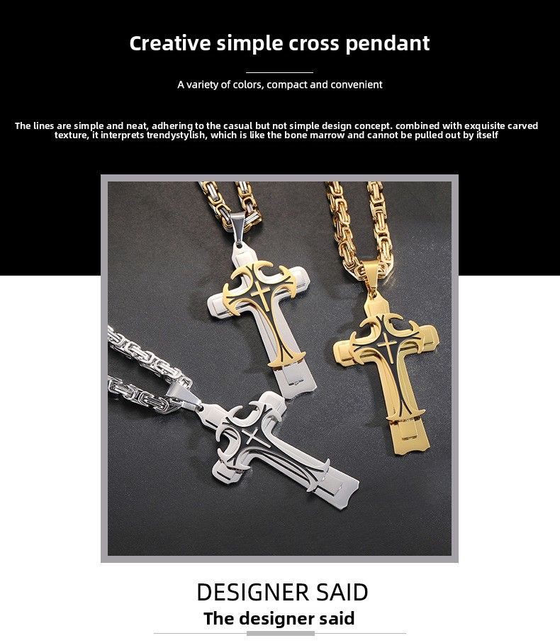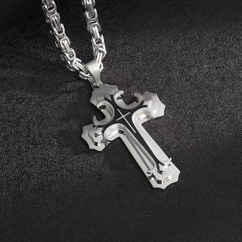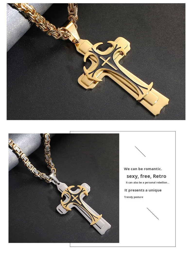 Double-layer etched and oiled cross pendant necklace, stainless steel and titanium steel, unisex.